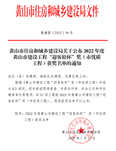熱烈祝賀我司承建的歙縣經濟開發(fā)區(qū)二期緯四路(經三路—經四路)、經三路(緯四路—緯五路)道排工程(項目經理:易曉云)榮獲2022年黃山市建設工程“迎客松杯” 獎。